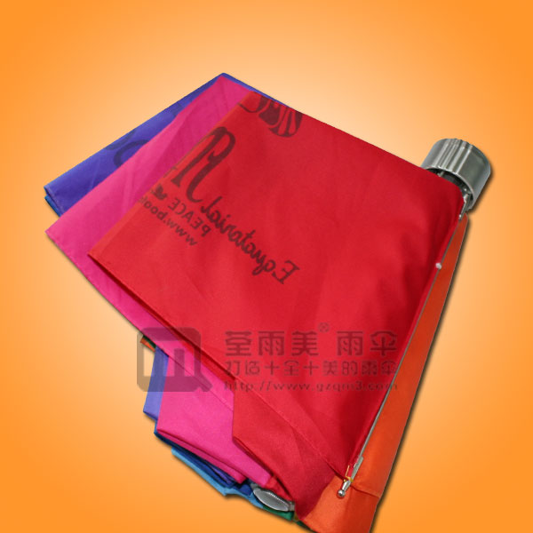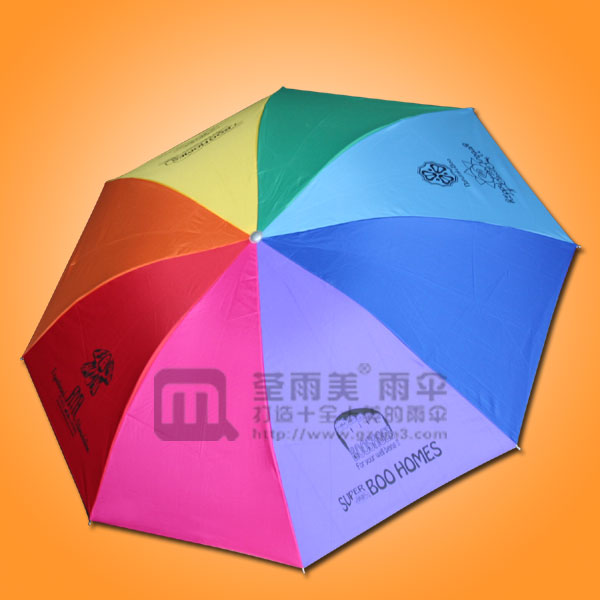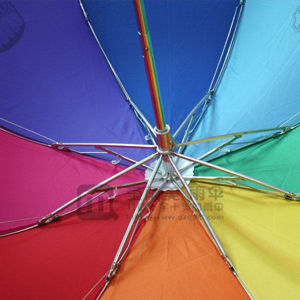 采用8条钢铁伞骨架,配搭高密度抗UV PG布料,8片不同颜色布料搭配成一把彩虹伞就像天边的彩虹一样靓丽