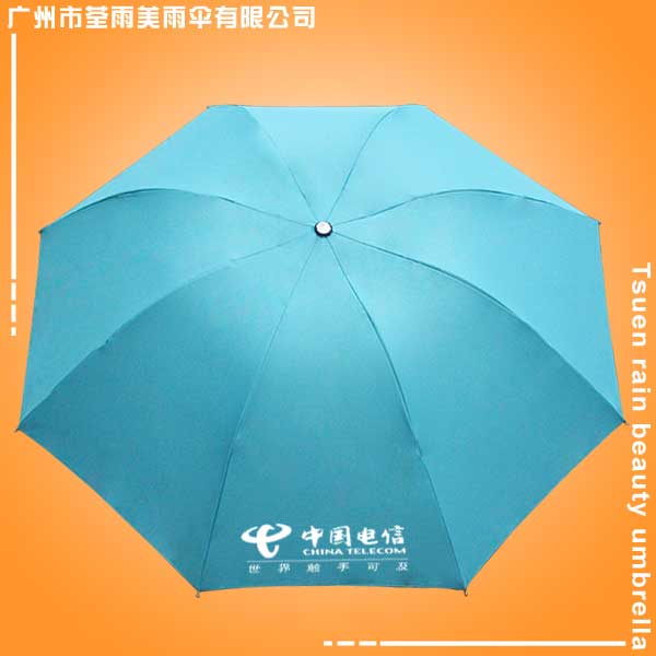 广州雨伞厂加工-中国电信广告伞 雨伞厂 三折雨伞 雨伞广告、雨伞尺寸21寸,展开伞架直径约106cm 经济、实用、大方!伞架采用8条钢铁伞骨电镀架搭配蓝色黑胶碰击布制作,伞套丝印双色logo中棒到四杆加长设计搭配磨砂黑色伞头舒适、耐用。