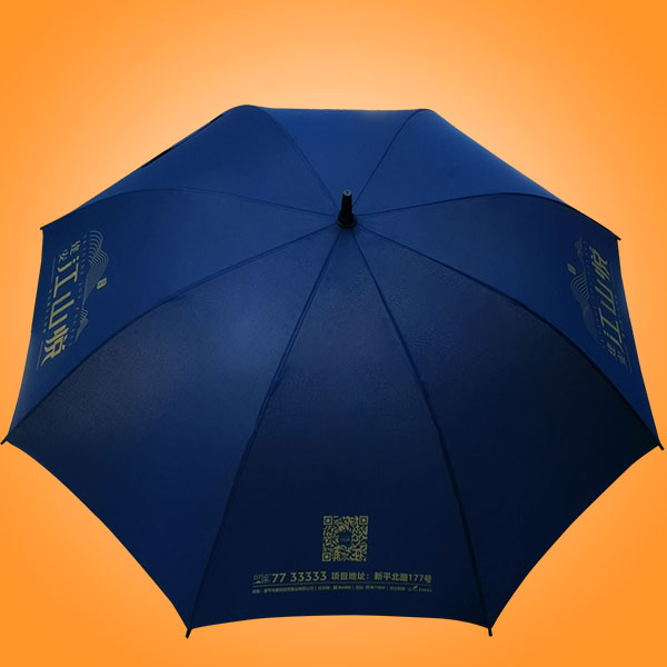 雨伞厂家 广东雨伞厂 晴雨伞定做 户外广告伞 江山悦楼盘广告雨伞、蓝色伞面遮阳效果好、伞架纤维不生锈、两个logo对称丝印金色、原胶颗粒制作纤维伞架耐用不易折断、伞面采用春亚纺制作。