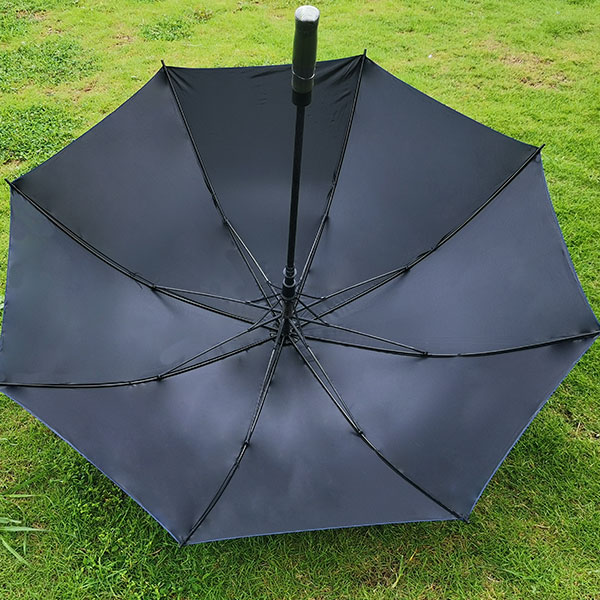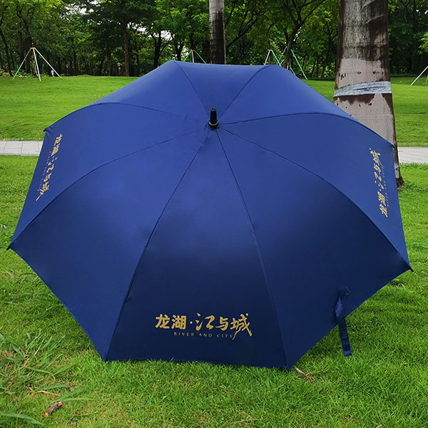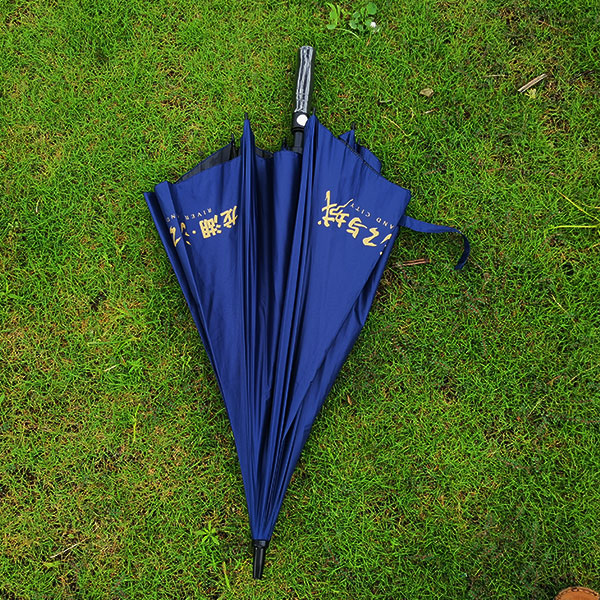 全遮光黑胶布雨伞,伞面金色印刷四片,蓝色黑胶布鲜艳抢眼,伞架纤维防生锈、韧性好。