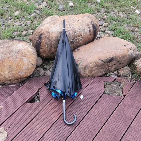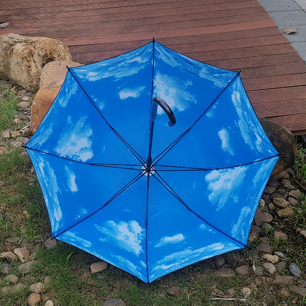 黑胶布数码印雨伞,内印蓝天白云鲜艳夺目,黑胶向外搭配23寸直杆伞架结实耐用