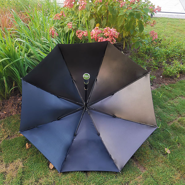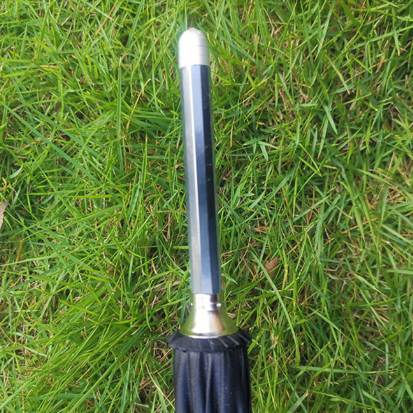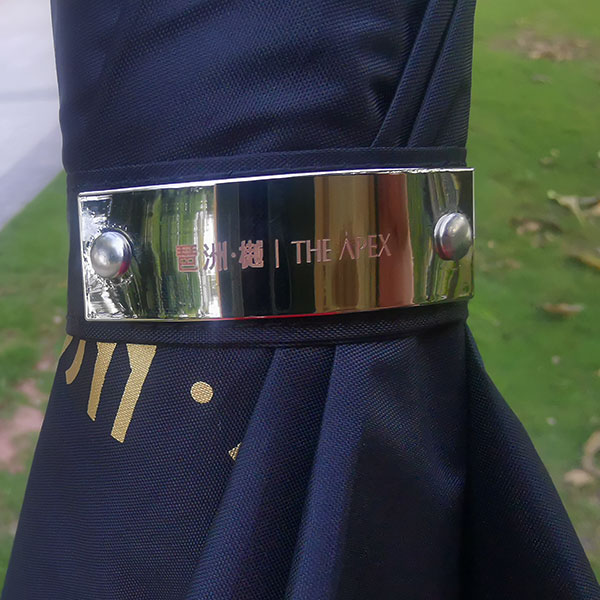 高端大气、华而实用、纤维伞骨结实不生锈、电镀加长伞头、伞面全遮光黑胶布料丝印金色logo,手柄雕刻logo,伞带铝牌雕刻logo高端华丽、25英寸