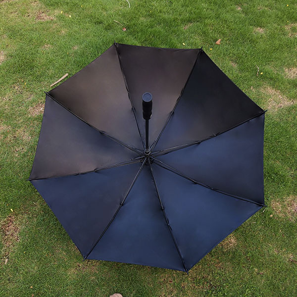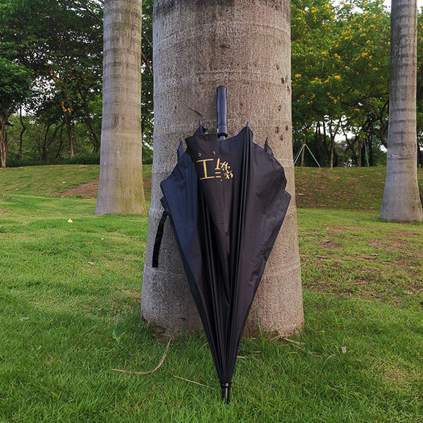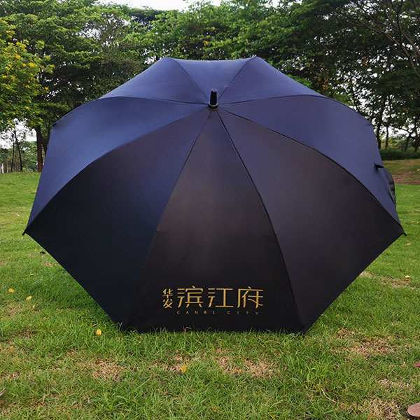黑胶布搭配高尔夫纤维伞架,伞面金色丝印对称、硬胶伞头舒适耐用。