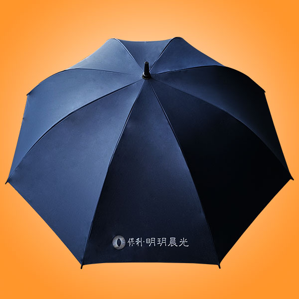 高尔夫雨伞塑料弯头,蓝色黑胶布丝印白色对称,伞架全纤维