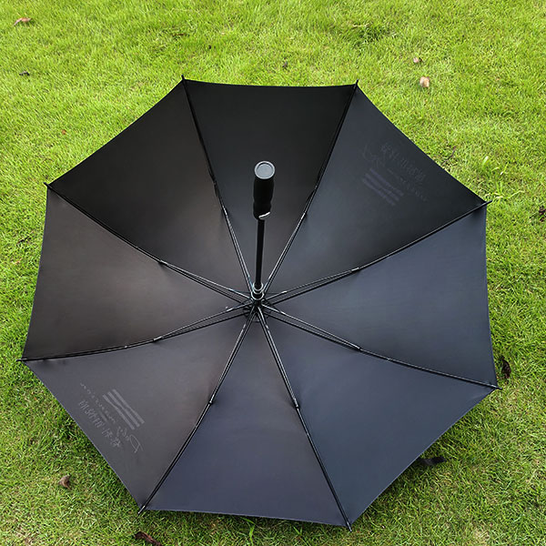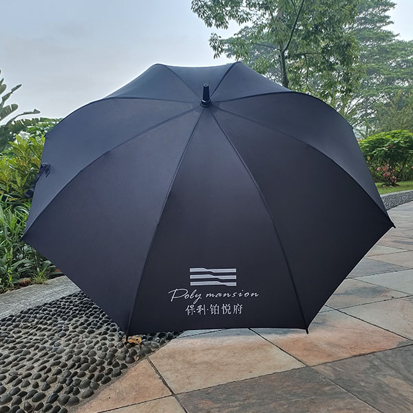 直杆雨伞搭配防泼水布料,伞面单色logo对称丝印,硬胶伞头耐磨耐用