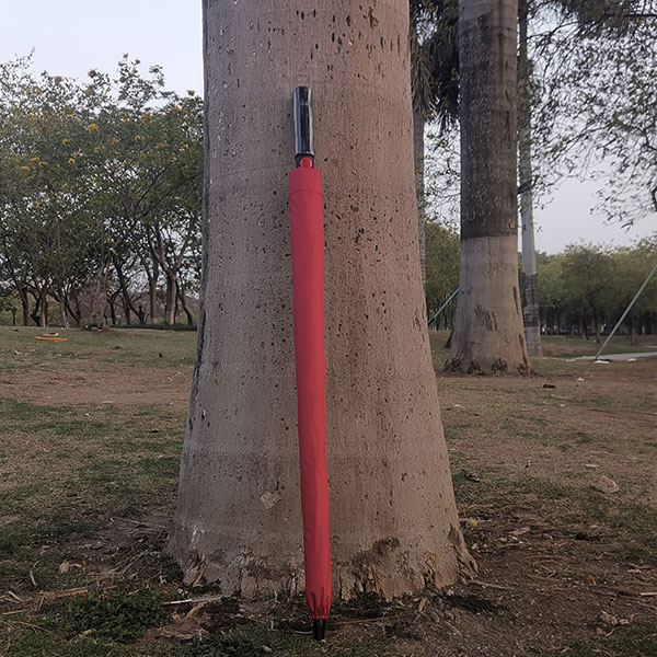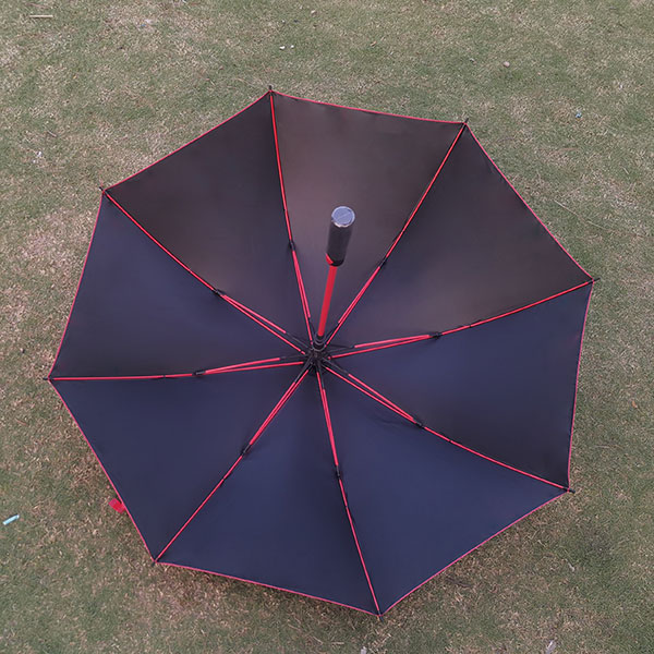 全遮光黑胶布料红色伞面,彩色伞架丝印两个logo,海绵手柄耐磨吸汗。