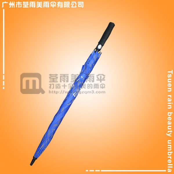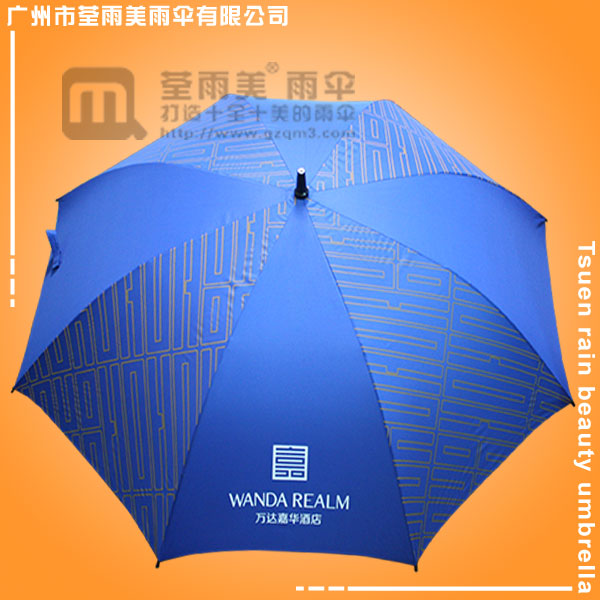 采用8条纤维伞骨架制作工艺,纤维中棒海绵手柄隐形自动开关,配搭高密度抗紫外线浅蓝色PG布料、伞面隔片满版网状印刷金色代表酒店的覆盖率、白色logo清晰显眼