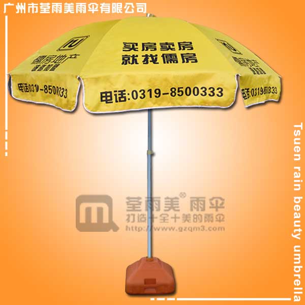 【广州太阳伞厂】生产-儒房地产太阳伞 广告太阳伞 鹤山太阳伞厂 太阳伞厂 工厂热线:020-81801255 13640737977 雨伞尺寸48寸,展开伞架直径约240cm 经济、大方!采用钢铁4.0防风骨太阳伞,伞布采用210黄色牛津银胶布防嗮伞面八片丝印,掉边丝印电话和地址让客户更容易找到商家位置。