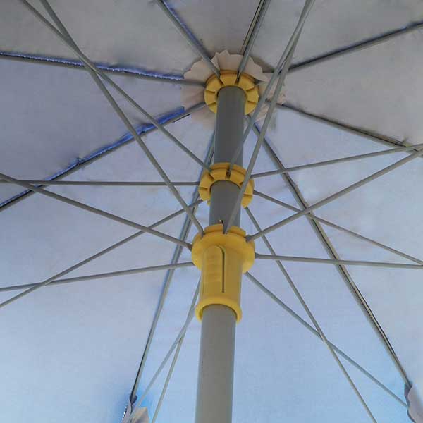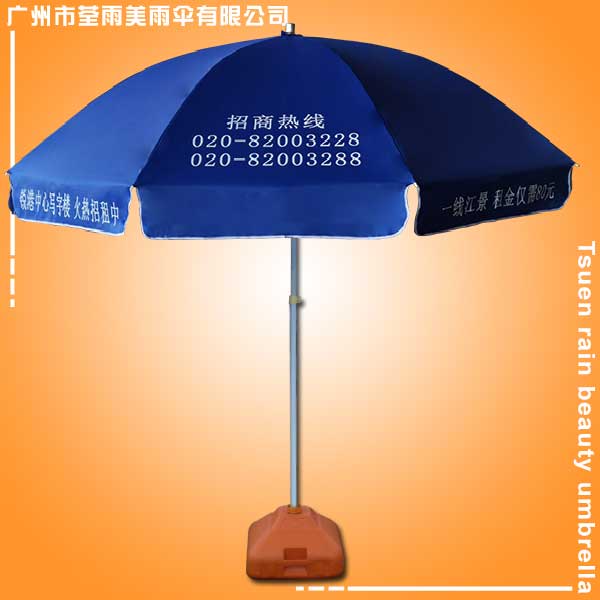 佛山太阳伞厂 生产-锐港中心广告太阳伞 佛山荃雨美太阳伞厂 佛山雨伞厂、渐变颜色丝印蓝色201D牛津银胶布、伞架4.5防风烤白漆伞架双层防生锈处理