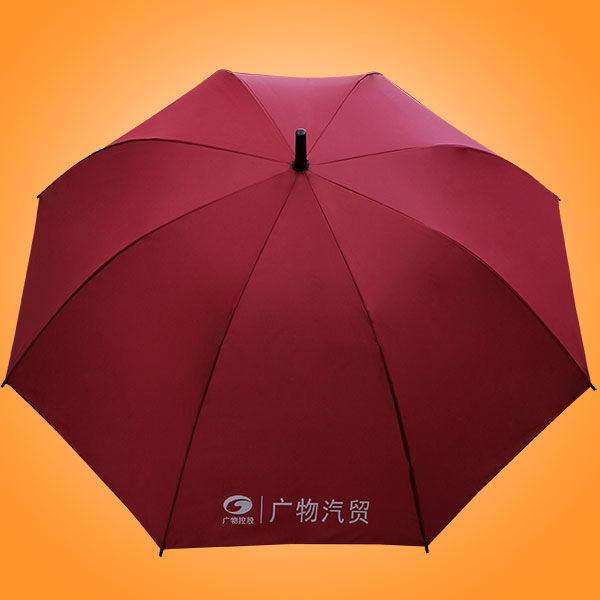 雨伞厂家 湛江雨伞厂家 广物汽贸广告雨伞 雨伞定做、半纤维14厘中棒弓片伞架,海绵手柄搭配190T银胶布,伞面单色丝印、伞面防晒处理,展开伞架直径约137cm