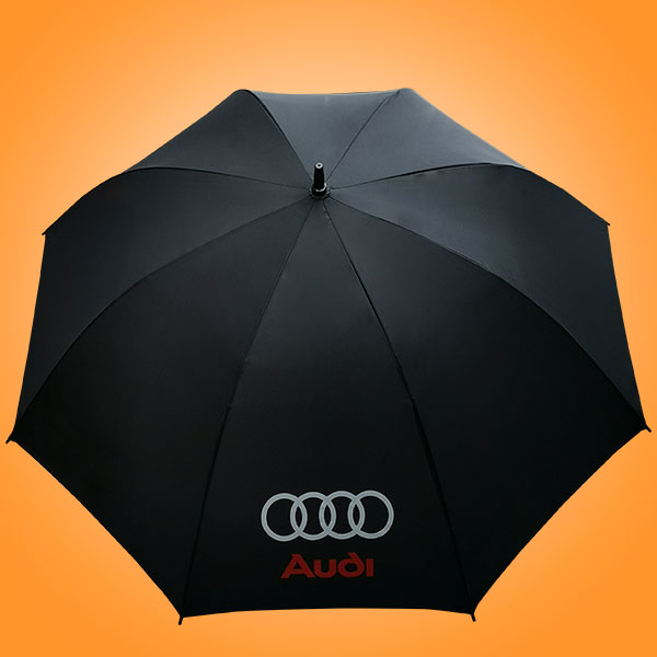 高尔夫雨伞厂定做奥迪广告雨伞,全纤维雨伞伞架独特防锈工艺,伞面高密度防泼水处理丝印双色logo,海绵手柄舒适防滑